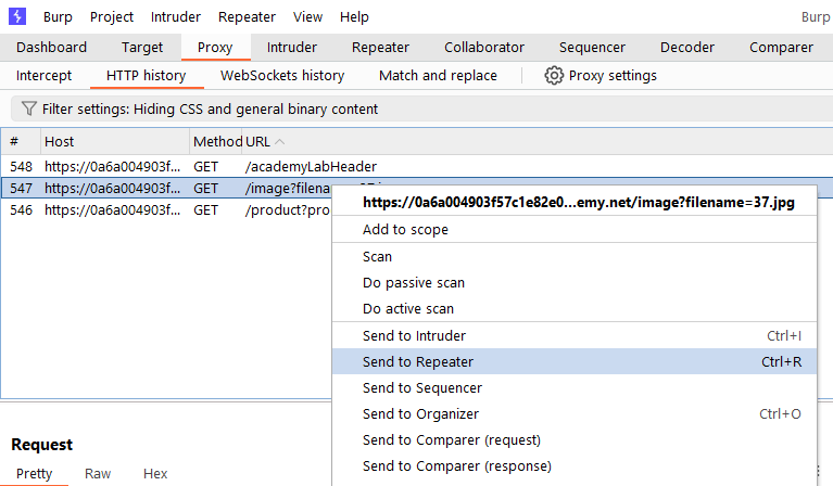 Odpalamy Burp Suite, przechodzimy na podstronę z wybranym produktem. Następnie z poziomu Burp Suite przechodzimy do zakładki Proxy -> HTTP History i znajdujemy żądanie wyświetlenia grafiki do wybranego produktu. Jeśli żądanie się u Ciebie nie wyświetla, patrz punkt wyżej (w poprzednim zadaniu wyjaśniam co należy zrobić).