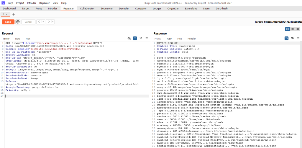 Tu również luka znajduje się w mechanizmie wyświetlania obrazka produktu i też musimy odczytać zawartość pliku etc/passwd. Jednak aplikacja blokuje sekwencje przechodzenia do katalogu wyżej, tak więc sekwencja ../ raczej tu nie zadziała, ale i tak spróbujemy jej użyć 😉