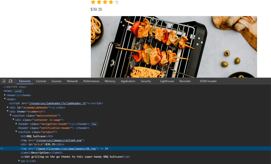 Zajrzyjmy jak wygląda pierwsze laboratorium. Jest to sklep internetowy. Jeśli klikniemy w dany produkt, możemy zauważyć, że przy każdym produkcie są gwiazdki z oceną, cena, zdjęcie, opis oraz link powrotny. Ponieważ w opisie zadania jest informacja, że luka znajduje się w mechanizmie wyświetlania obrazków produktów, musimy bliżej się temu przyjrzeć.