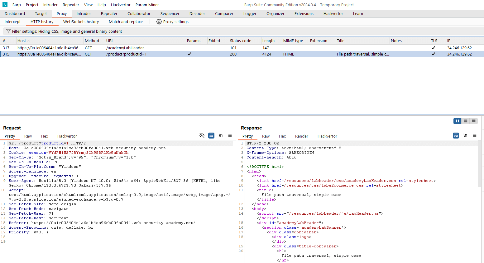 Odpalamy Burp Suite, przechodzimy na podstronę z wybranym produktem. Następnie z poziomu Burp Suite przechodzimy do zakładki Proxy -> HTTP History i znajdujemy żądanie wyświetlenia grafiki do wybranego produktu. Jeśli żądanie się u Ciebie nie wyświetla, patrz punkt wyżej (w poprzednim zadaniu wyjaśniam co należy zrobić).